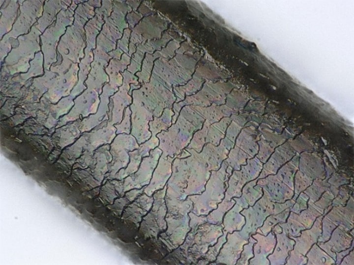 Il microscopio digitale 4K Serie VHX vanta un'ampia profondità di campo, che consente di osservare con immagini 4K chiaramente a fuoco le cuticole dei capelli anche ad alti ingrandimenti.