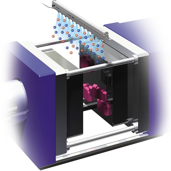 Durante lo stampaggio a iniezione possono essere generate forti cariche elettrostatiche. I prodotti diventano difettosi quando particolato vi aderisce sopra a causa dell’elettricità statica. Questi prodotti devono essere smaltiti. L’elettricità statica può anche far sì che i prodotti aderiscano agli stampi. Questi prodotti devono essere rimossi manualmente, il che riduce la resa. Uno ionizzatore può impedire l’adesione di particolato e garantire che i prodotti non aderiscano allo stampo.