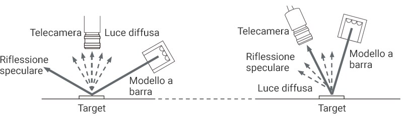 Le luci a barra possono essere utilizzate per proiettare una striscia di luce lungo il bordo di un target. A seconda dell’angolo della luce e della telecamera, il modello a barra può essere utilizzato per aumentare o ridurre la riflessione speculare da un target. Per illuminare un target con la riflessione speculare (ad esempio la punta di un pin) la riflessione diretta della luce deve tornare indietro alla telecamera.