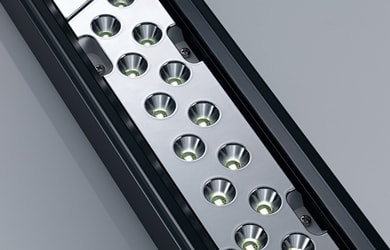 Per creare una luce LED di grande potenza, i LED ad alta intensità vengono disposti in una configurazione sfalsata, molto ravvicinata. Inoltre, usando i riflettori conici è possibile sfruttare tutta la luce generata dai LED. Questo consente di ottenere un'illuminazione ad alta intensità con lunghe distanze di lavoro (LWD), difficile da ottenere con le luci LED convenzionali. Inoltre, su tutta l’area di illuminazione viene applicata una finitura della superficie a specchio, il che consente un uso efficace anche dell'illuminazione che viene rimandata all'interno della lampada dalla copertura di protezione o dalla piastra di diffusione. Quando non si utilizza una piastra di diffusione, è possibile emettere una luce con una luminosità sufficiente anche con una LWD di 3000 mm.*