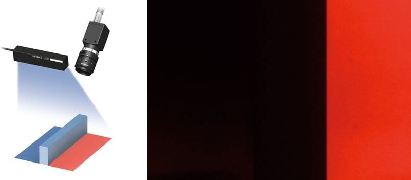 Il filtro taglia banda blu toglie la luce riflessa nella gamma del blu e solo la luce dal foglio di conversione della lunghezza d'onda entra nell’obiettivo. In questo modo si ottiene un'immagine del pezzo bianco come quella acquisita con una retroilluminazione.